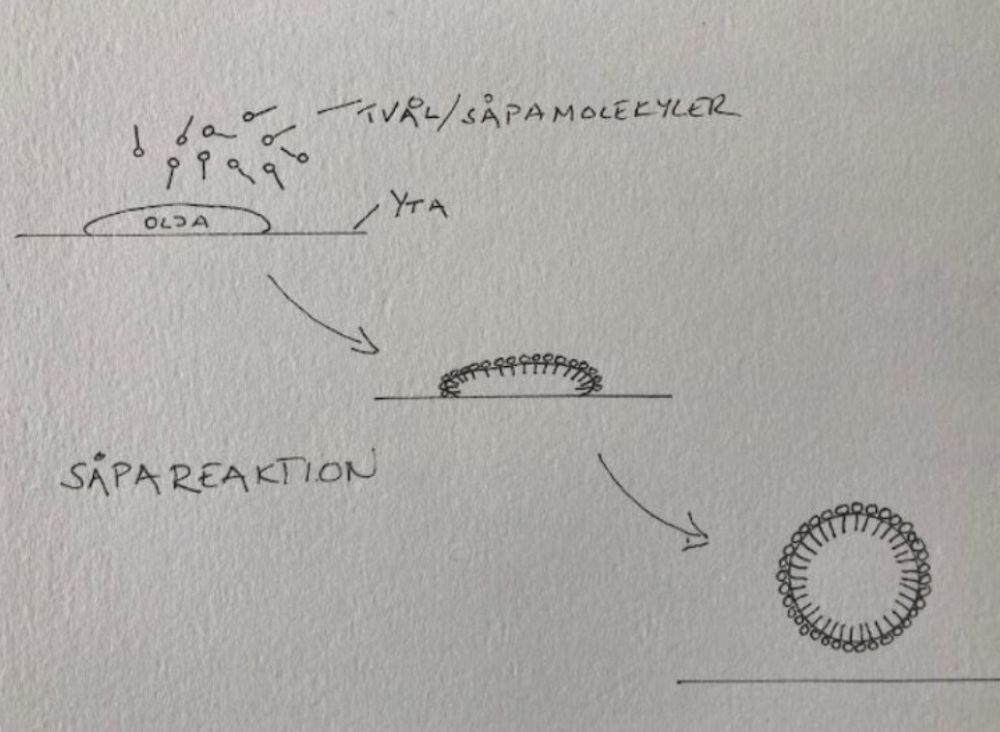 Men det är nu det börjar bli intressant. För vad händer om man tillsätter mindre kaliumhydroxid än man borde enligt förtvålningstalet? Jo, då finns helt enkelt inte tillräckligt med lut för att förtvåla allt fett. Man kallar det här för överfettning och kan göras genom en kalilutrabatt (altså mindre lut än förtvålningstalet) eller genom att extra olja tillsätts efter att förtvålningsprocessen är avslutad. Då brukar det vara ungefär 2% turkisk rödolja som tillsätts, vilket egentligen inte är en olja i sig utan en sulfonerad ricin- eller olivolja. Det är det här överskottet av olja i såpan som linoljeförespråkarna poängterar är viktiga för golvet i och med att de skulle motverka uttorkning av träet. Men stopp ett tag! Skulle inte såpa lösa fett? Var inte det hela poängen med en såpa? Så hur kan såpan innehålla olja? Borde oljan i såpan inte lösas upp? Jo, det är helt riktigt, men nu pratar vi om en annan process än lutförtvålning av fettet. Lutet har redan gjort sitt och finns inte kvar i såpan. Istället har den som vi nämnt skapat kaliumsalt. Den här tvålmolekylen har en hydrofil del (karboxylgruppen) och en hydrofob del (kolkedjan). Den hydrofoba delen löser sig i fettdroppen och den hydrofila stannar utanför. Det här gör att fettet blir lösligt i vatten, men oljan som molekyl upplöses dock inte. Kan man kanske förklara det som en omvänd emulgering? Jag gör ett försök att visualisera det genom en skiss nedan.