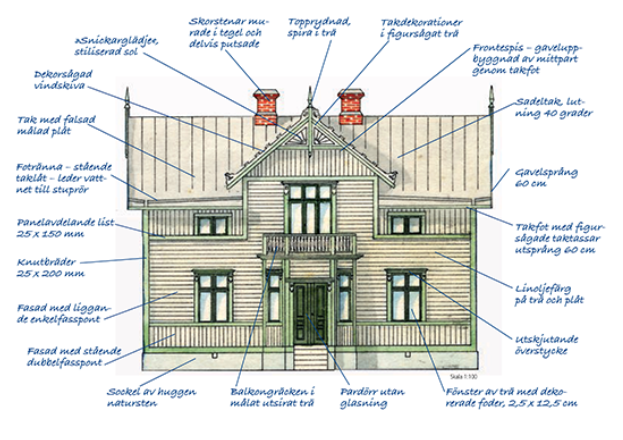 Schweizerstilens fortsatt starka influens under 1890-talet kan tydligt ses i kvarvarande lövsågerier, den fortsatt höga stenfoten och breda gavelsprång. Snickarglädjen kring fönster och på listverk blir under årtiondet dock något mer modest, men finns i hög utsträckning kvar på förstukvistar, taktassar och gavelspetsar. Gavelröstets topp är inte sällan prydd av stiliserade solar och spiror i trä. Arkitekternas strävan efter ”äkta material” och den goda tillgången på hyvlade trävaror gör att trästilen håller i sig. Fasaden delas liksom under perioden 1850-1880 fortsatt in i omväxlande liggande och stående panelfält. Panelen utgörs främst av stående enkelfasspont och liggande dubbelfasspont samt stockpanel. Fälten som tidigare avdelats med listverk avdelas nu oftare med en enklare bräda i accentfärg. Husets mittaxel markeras gärna med en frontespis på husets långsida. Andra tidstypiska drag är de oglasade pardörrarna och det förhöjda fasadlivet samt mindre fönster nära vindsgolvet vilket gav illusionen av två våningar.
