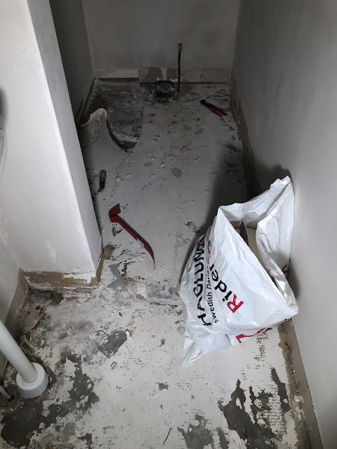 När plastmattan väl är ute flytspacklar jag golvet och lägger hors, en borstad ölandskalksten som jag köpt in för att lägga i hallen men ännu inte kommit mig för. Ovanför handfatet sätter jag några skift half-tiles som blivit över efter kaklingen i köket. Sedan får Lindsey måla. Hon har kommit fram till ”Hennes nya namn”, ja det är alltså titeln på Ferrante-romanen som nu ger färg åt toaletten. Någon form av burgundvariant av rosa, matt med ett stänk av jord. Över förväntan bra och jag inser att jag har någon gammal bronsfärgad spegelram efter mormor som ligger och skräpar som nog skulle passa över handfatet.