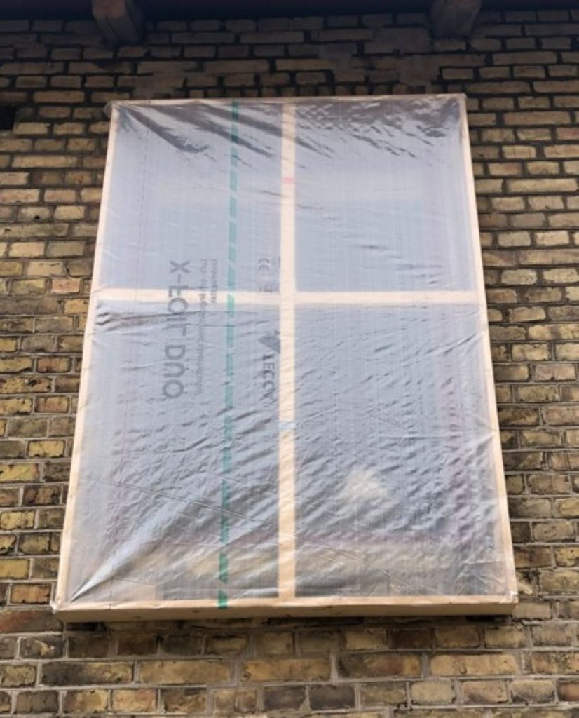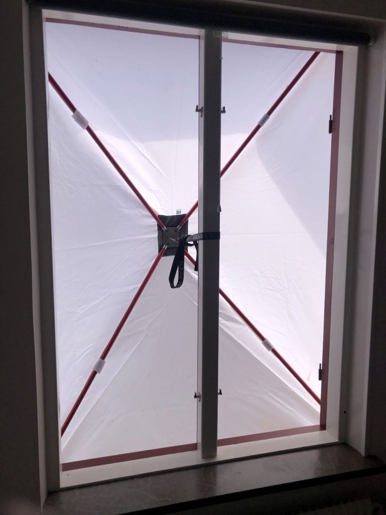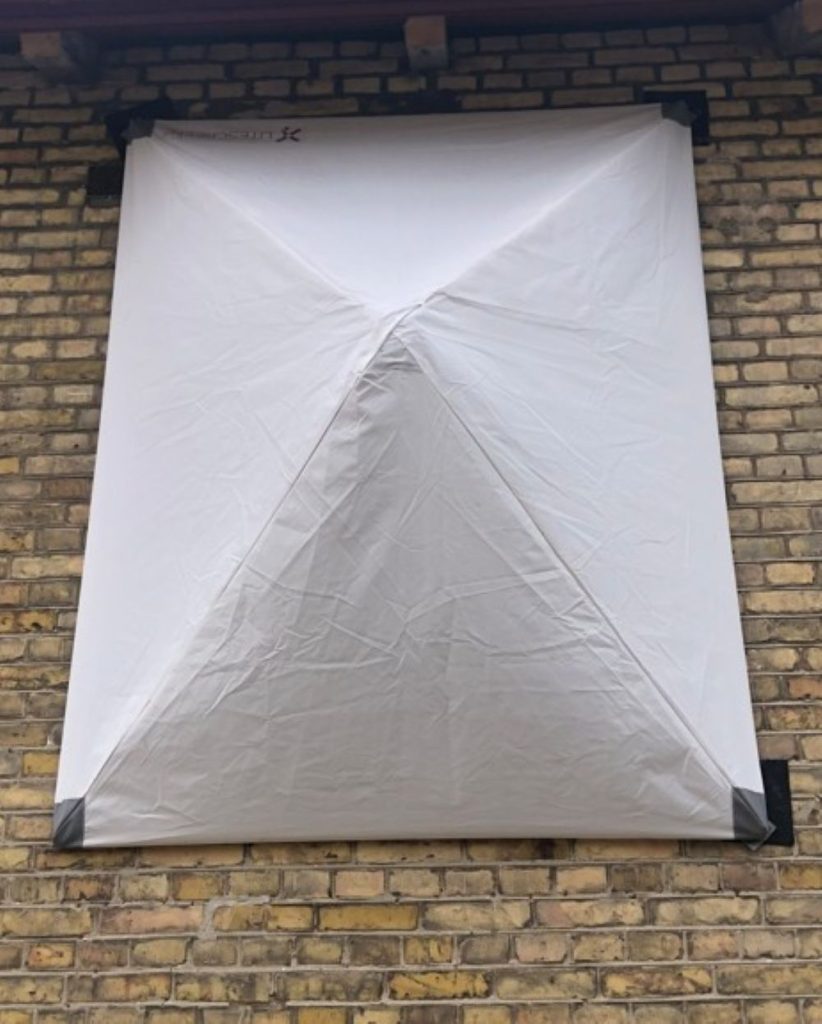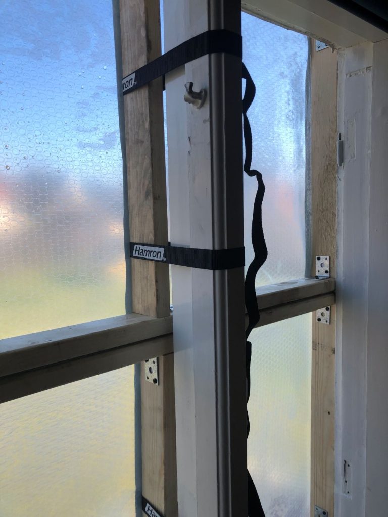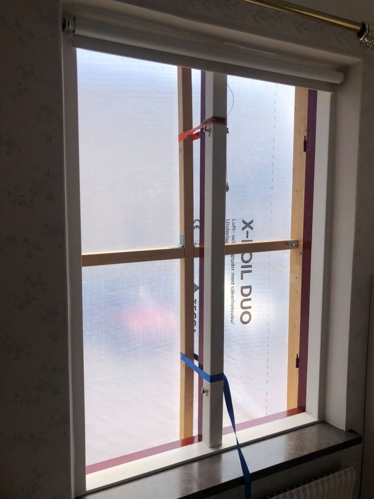 För det tredje: Vanlig byggplast fungerar inte att spika eller häfta fast så att det håller. Detta eftersom plasten inte är armerad, vilket gör att den kommer lossna från karmen så snart det börjar blåsa. Köp istället säkerhetsväv på din lokala byggfirma och häfta fast med häftpistol. Får du inte tag på säkerhetsväv är alternativet att själv armera den plast du har med hjälp av silvertejp/gaffatejp.