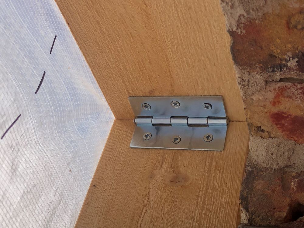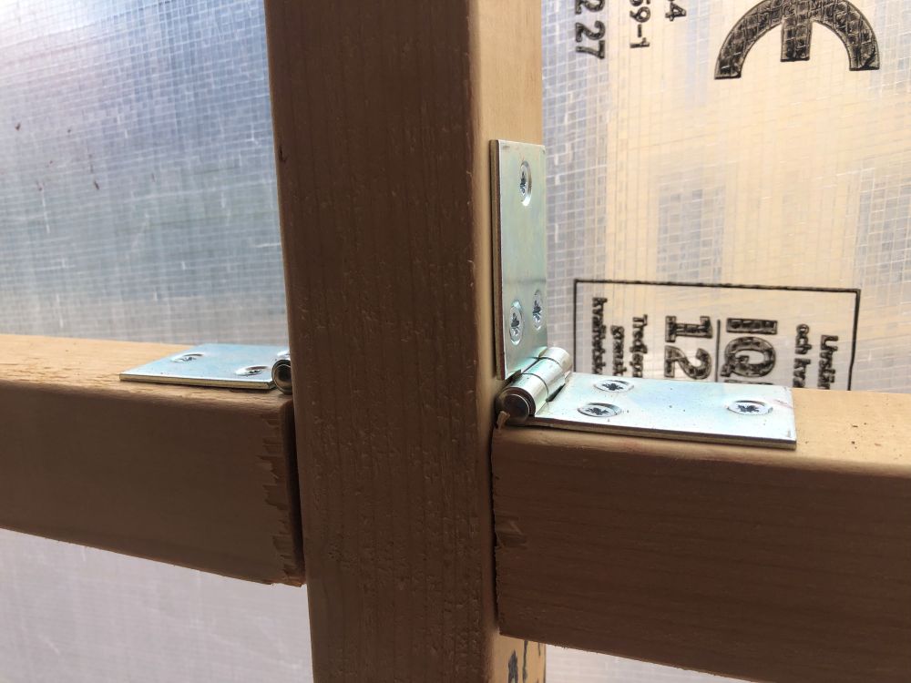 En lite mer avancerad form av väderskydd som kan fästas inifrån huset är den ledade ramen. En ledad ram byggs på samma sätt som en fast ram men istället för fasta hörn sätts ett gångjärn i varje hörn. Ramens långsidor kan med fördel dessutom delas och hållas ihop med ett gångjärn mitt på sidostycket, varpå den totala längden i hopfällt läge blir avsevärt mindre. Mittstolpen som förstås också måste vara löstagbar fästs i ramen med skjutreglar som skruvas fast i mittstolpen och ett hål för regeln borras i över och understycken. Vill man spara in på pengarna så fungerar det även bra att borra och limma i plugg i mittpostens ändträ istället för att använda skjutreglar. Har sidostyckena delats behövs även ett tvärstycke för att skapa stadga åt ramen. Tvärstycket gör jag i två delar och fäster med gångjärn mot mittstolpen. I ändorna fäster jag skjutreglar och borrar motsvarande hål för dessa i sidostycket. Täck till sist ramen med säkerhetsväv och du har tillverkat ett ihopfällbart väderskydd. Den här versionen av väderskydd säljer sig nästan själv med samma argument som man sålde hemmagymutrustning på 90-talet: Den går lätt att skjuta in och förvara under sängen när man inte använder den.
