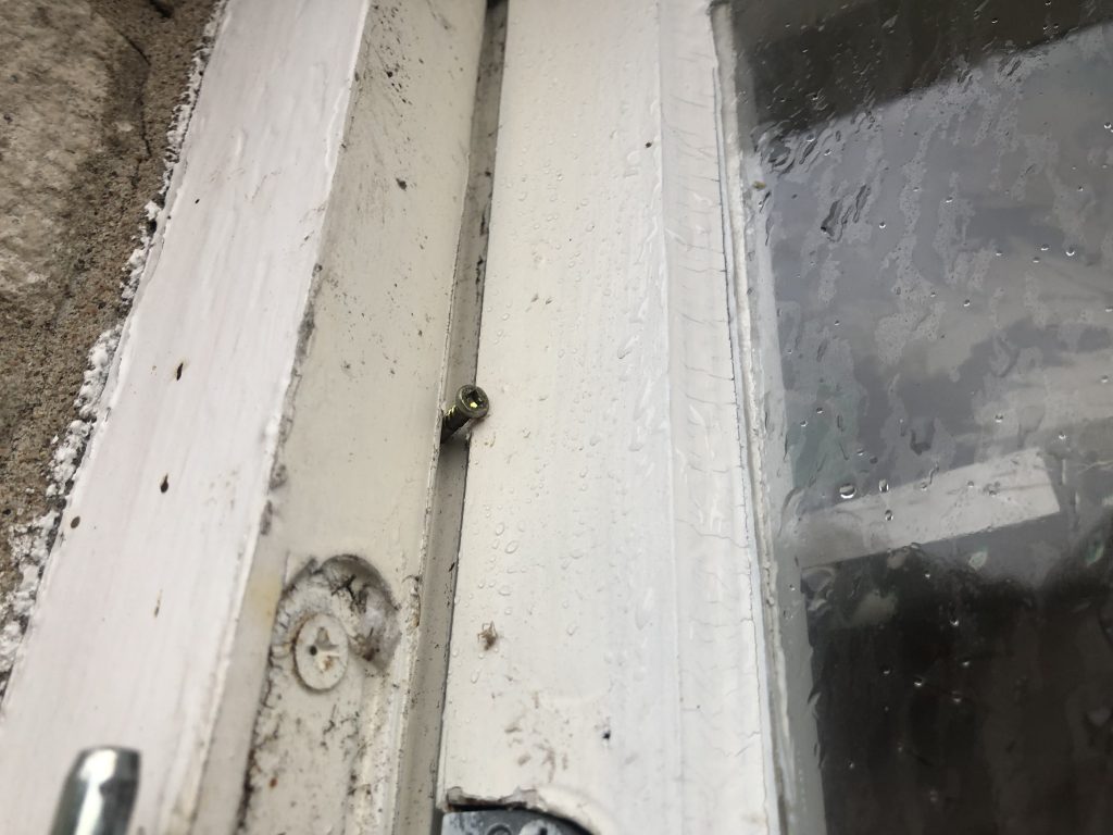 För det fjärde: Placera spännbanden som du fäster byggfönstret med runt mittposten just ovanför fönsterlåsen. Där spännbanden går runt mittstolpen på byggfönstret sätter du en liten skruv på vardera sida, alternativt en skruv rakt igenom spännbandet. Det här motverkar också att väderskyddet glider längs fasaden.
