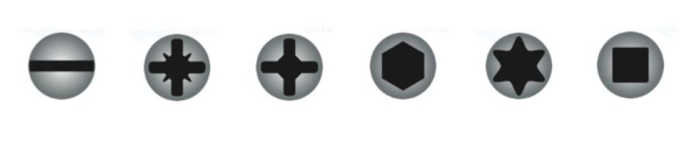 Från vänster till höger: Spårskruv (SL), Pozidrive (PZ), Philips (PH), Insex (H/HX), Torx (T/TX), Robertson (R/RS/SQ).